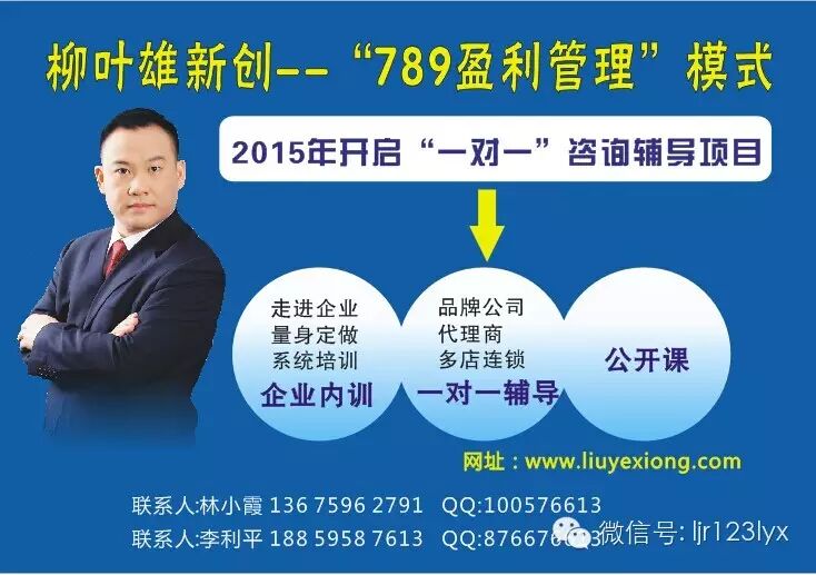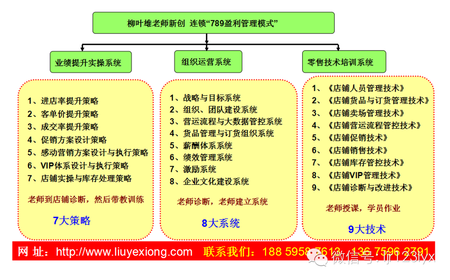 柳叶雄老师最新开发的“连锁789盈利管理模式”从培训+店铺系统落地,从7大策略提升店铺业绩、8大系统完善运营系统、9大零售技术提升盈利能力,欢迎来电咨询“连锁789盈利管理模式”!您也可以直接回复数字“32”即可获得《连锁789盈利管理模式》课程!