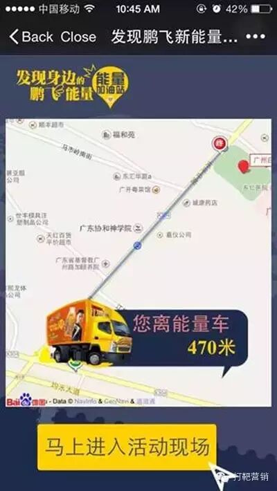自6月份启动以来,每月,东鹏特饮微信公众平台针对此次发现鹏飞能量活动会上线定制新主题。消费者只需进入公众号主页,点击定位发现“鹏飞能量”,就可以知道当月线下活动举办时间、地点,并测出与鹏飞能量站距离,让其对活动有更为精确的空间定位体验。