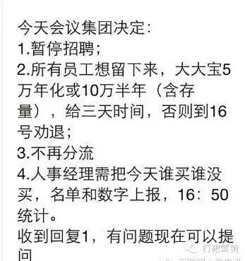 最近互联网金融行业让王老师实在是揪心啊。王老师昨日得知消息,大大集团(大大财富)决定暂停招聘工作,并对员工发出通牒,所有员工想留下来,需存大大宝5万元年化或10万半年(含存量),否则到16号劝退。这样的平台,说不定哪天就雷了。如果你或者你身边的人投资了它,赶紧想尽办法先撤退出来吧。12月8日,某宝出事当天,这家公司就开始大量招聘其员工。你贪的是他们家的高工资,可人家要的是你的本金,员工每一份工资,都是建立在自己投资的基础上的。毫无门槛的工作,月薪可以达到8000以上,大家还认为是理所当然。都不想想,这个公司的待遇都可以比得上华为,比上国企了。