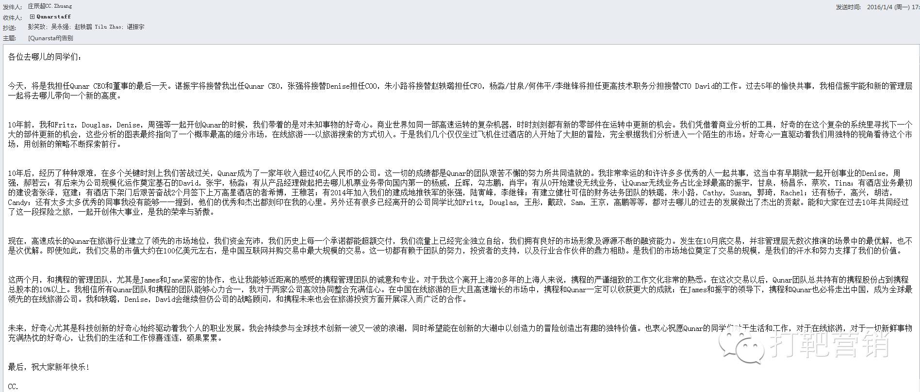 1月4日,去哪儿网创始人、CEO庄辰超发内部信宣布即日起卸任去哪儿CEO和董事一职,湛振宇将接替庄辰超出任去哪儿CEO。就在几天前,虎嗅就预测2016年会下任的CEO,庄辰超就位列其中。新年上班的第一天就应验了,这也实在是太快。