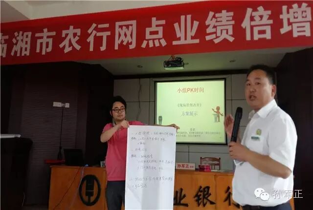 在讲授现场管理时,孙军正老师重点讲了以下内容:银行营业厅的定位、客户对银行网点的服务期望、营业厅现场管理要素、户内广告的管理、营业厅宣传资料摆放管理关注重点、营业厅现场陈列的管理、现场管理开会技巧等。