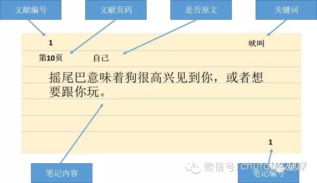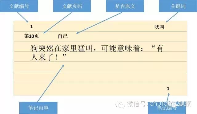 是不是很简单,在索引卡片左上角写上文献的编号,页码以及“自己”;在右上角写上关键词“吠叫”。卡片正中就是要记录的笔记内容。我们把原文改编成“自己”的语言,“狗突然在家里猛叫,可能意味着“有人来啦”!”并不是原封不动的抄录,这就是我们聪明课题推荐的笔记方式。一开始,大家可能还不是很习惯这种笔记的方式,因为这样做笔记的话,需要我们去努力的思考这句话的意思,明白了这句话的意思之后,再用“自己”的话把它写出来。但是,一旦你熟悉了之后,你会发现,写文章原来可以这么简单,你会越写越轻松。从记笔记的基本功开始到轻松写作需要我们持续的练习哦。