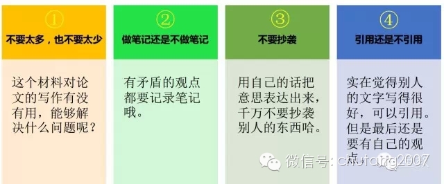 一开始的时候,我们可能会一股脑的记了很多笔记,写得手都要断掉。结果发现很多笔记最后我们根本用不上,浪费了大量的时间。这个时候,你可以问问自己:“这个材料对论文的写作有没有用,能够解决什么问题呢?”这样就可以避免记下太多的没有用处的笔记。当然,你可能还会犯下另外一个错误,就是记得太少了。阅读到复杂的文字的时候,你可能会对自己说“我没必要把它们都抄下来,我记在脑子里就行了。”但是,你是记不住的!因此,那些必须的资料,一定要用索引卡片记录下来。如果实在太累了,就休息一会再来吧。