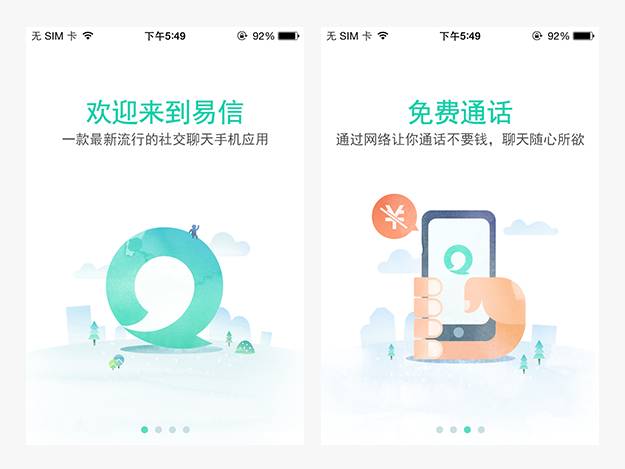 以易信为例,采用文字与水彩插图结合的方式,文字分为2个层次,大标题与小标题,大标题是对主功能的概括,小文字是对其功能模块的详细描述或进一步补充说明。