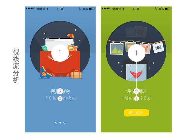 如下图为天猫客户端的引导页,分析其视觉流发现,浏览的顺序从插图到主文案,再到辅助文案,缺点在首次看到的是插图而不是文案,插图相对文字理解相对困难,因此未能快速地获取该页的主要信息,可以考虑将文案与插图的位置进行互换,这样会好一些。