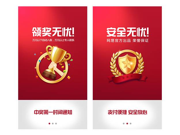 又如网易彩票,引导页的主色选用了与网易自身的红色相一致的红色,在公司产品系统性上保持高度的一致性。