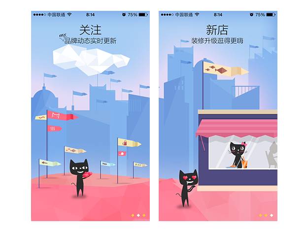 通过具体的元素、场景来表现文案,采用写实、半写实的方式进行表现,有些应用还会配以水彩风格。以天猫为例,天猫是一款购物应用,在设计上通过商场、店铺的实际场景的具体描绘,渲染轻松、欢快的购物过程。