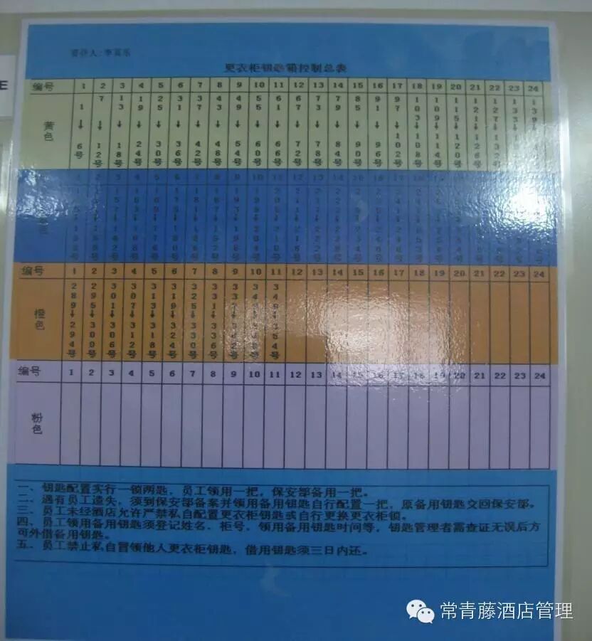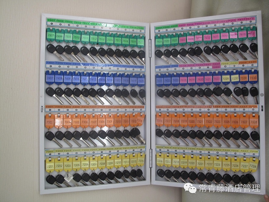 首先要界定一下老板手中必备哪些钥匙,然后要界定一下钥匙五步曲管理,第一步钥匙柜管理,钥匙柜是摆放钥匙地方,那么里面要确保摆放整齐,一排排进行摆放。分部门进行摆放,每排摆放用颜色区分,增加视觉效率。第二步就是钥匙柜旁边要有钥匙平面图管理,钥匙平面图要和钥匙柜里面摆设设计一样,颜色要相应,部门要分层一样,让员工拿钥匙时候可以看到钥匙平面图,然后打开钥匙柜就可以一眼找到想要钥匙。第三步钥匙领用登记表管理,每个人拿钥匙都要在登记表登记拿时间和放回时间以及签名。第四步钥匙负责人标签要张贴,第五步钥匙要编号,编号和各门或锁的编号一致,用英文区分各部门,用数字区分各门锁,确保拿钥匙可以拿对。