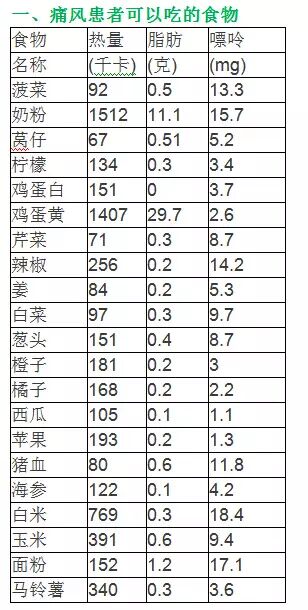 蔬菜、水果和奶类食物含有较多钠、钾、钙、镁等元素,在体内代谢后产生偏碱性物质,可提高尿酸盐溶解度,加快排泄,防止结石形成。合并高血压者给予限制钠盐。西瓜和冬瓜不仅属于碱性食物,而且还具有明显的利尿作用,对痛风病人更加有利。介绍了这些膳食原则后,很多痛风病人并不知道哪些食物的嘌呤含量高,哪些嘌呤含量低,通过下面的表,就可以很直观了解我们应该多吃哪些,少吃哪些了。