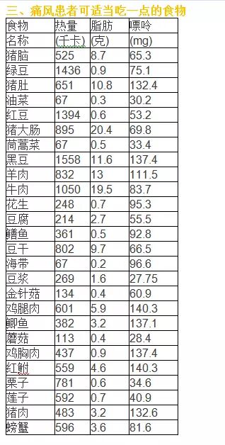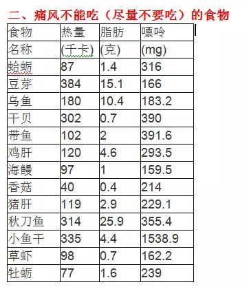 痛风病人应长期限制嘌呤的摄入量,动物的内脏如肝、腰、胰、和鲭鱼、沙丁鱼、小虾、肉汁、肉汤要严格限制食用。急性期必须严格选用微量嘌呤的食物,缓解期则可交叉使用嘌呤中等量的食物和微量嘌呤的食物。