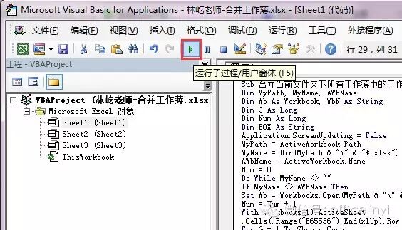 然后点击“运行子过程”按钮,或按“F5”键执行此命令,如下图: