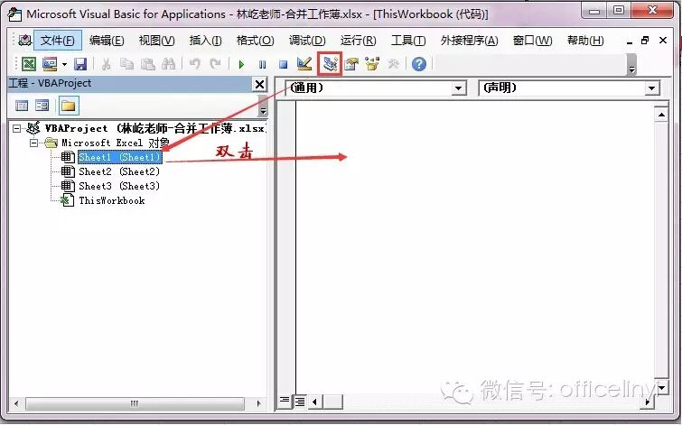 双击左侧的“Sheet1”,弹出代码录入窗口。顺便说一下,如果没有左侧的“工程资源管理器”,点击上方命令栏中的“工程资源管理器”按钮即可,如下图: