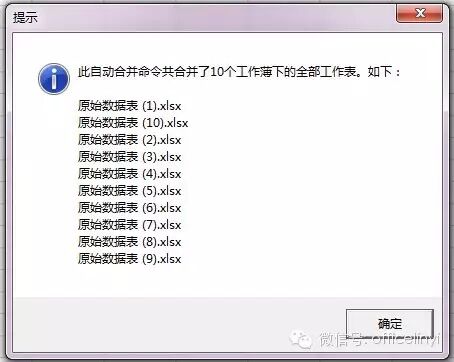 第四步,等一会儿(时间因工作薄数量和电脑处理速度不同),弹出对话框,代表合并完毕,如下图:
