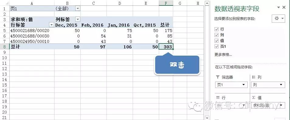 双击F8单元格的最终总计的合计数:303