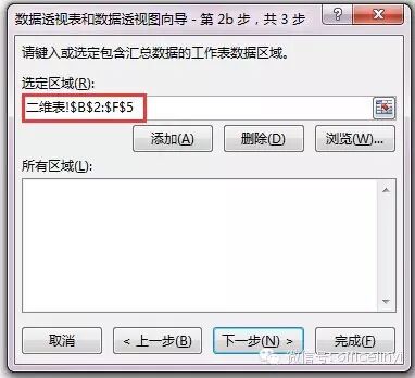 在“数据透视表向导——步骤2b”中的选定区域引用二维表中B2:F5区域,注意不要选数字区域,继续点击下一步。