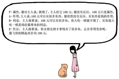 ★运用比喻:比喻可以让语言生动而有趣,让晦涩难懂的内容更好地被理解。比如在讲授什么是FABE时,使用猫和鱼来进行比喻: