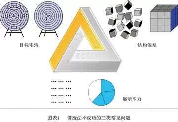 讲授法若不成功,最常见的三类问题是:目标不清、结构混乱、展示不力。目标不清,体现在对学员对象了解不够,对讲授目标不清晰;结构混乱,体现在组织讲授内容时逻辑不够清晰;展示不力,体现在设计PPT时对内容的呈现没有做到重点突出(见图表1)。