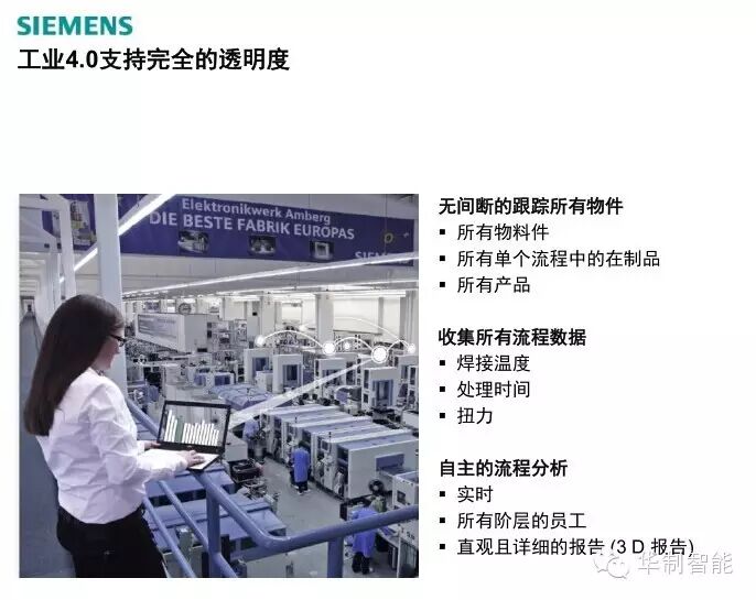 下一个分享的例子是德国西门子,西门子也是德国非常著名的行业领袖,他们一直以高质量闻名全世界。它的一个系统就是可以对所有生产的物件和物料间进行无间断的跟踪,通过增强仿真性能辅助工人和其他操作人员,所生产的产品不仅仅是简单的图象,而是图象加上仿真。同时,西门子也进行了实时的监测,监测增值链当中的技术指标,只需要点击鼠标就可以看到产品和物件料的情况,再点击鼠标就可以看到问题和出现故障的地方。