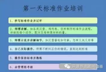 肯德基内部对新进员工实行师傅带徒弟的一对多模式。肯德基的标准五花八门,各类操作都有标准,如大家熟知的就是它炸薯条精确到多少秒。健全的制度可以解决很多生产和管理问题,前提是认真严格执行。